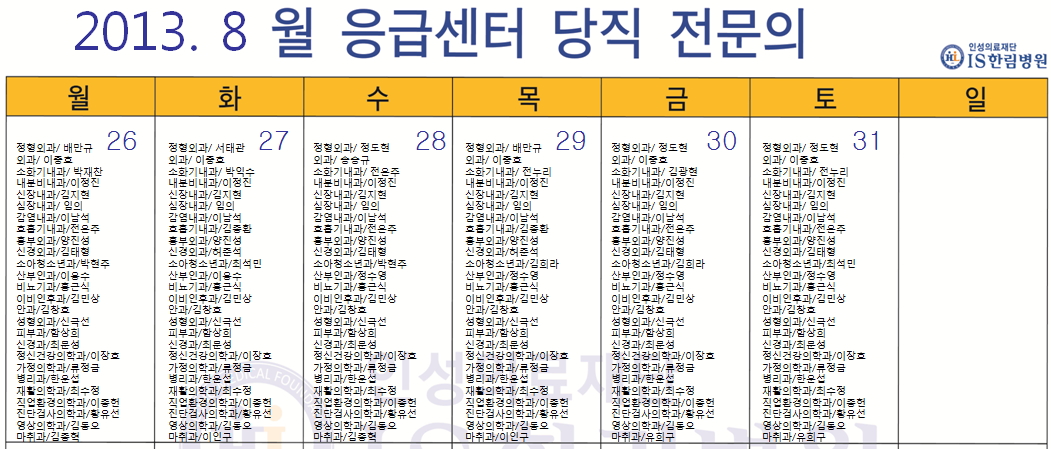 8월 응급의료센터 당직전문의 명단