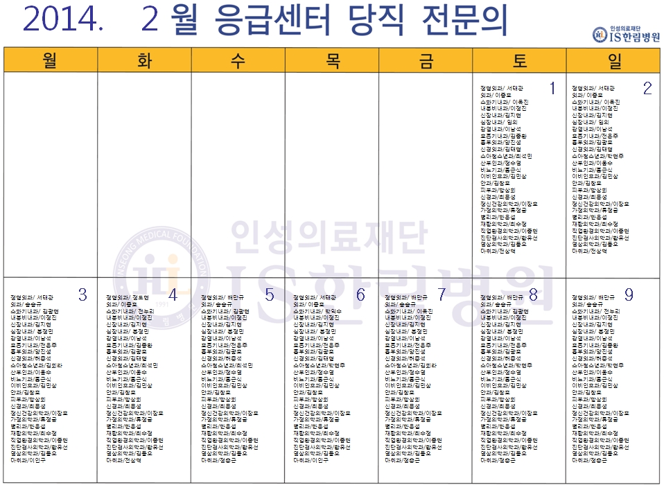 2월 응급의료센터 당직전문의 명단