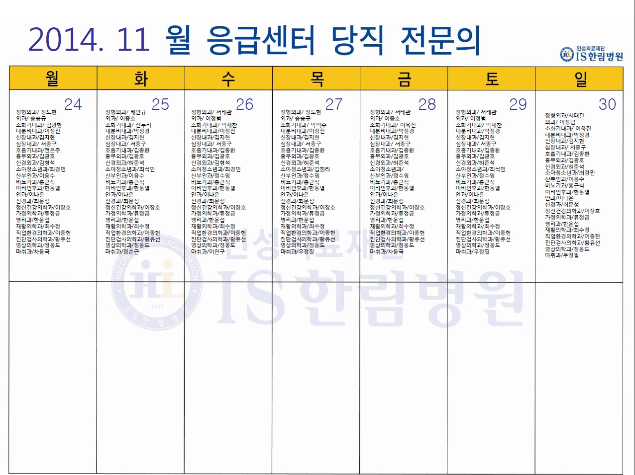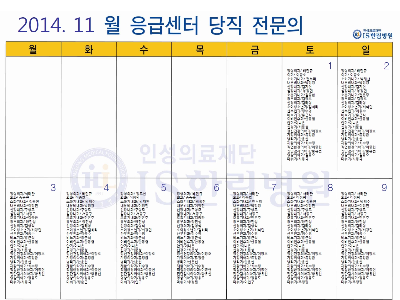11월 응급의료센터 당직전문의 명단