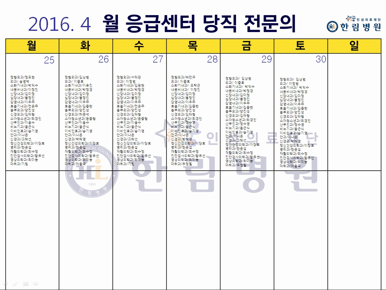 4월 응급의료센터 당직전문의 명단