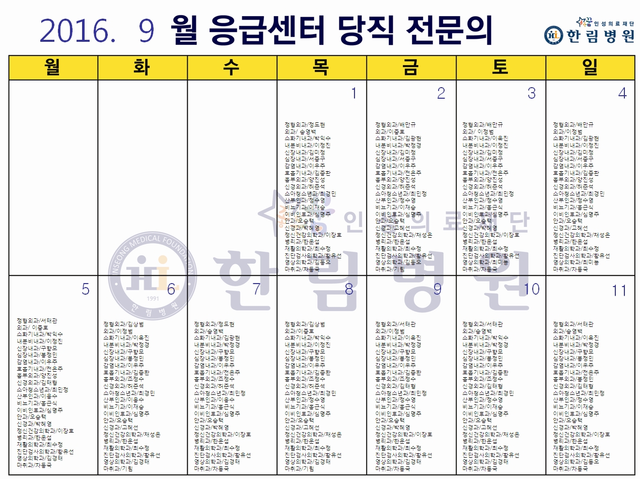 9월 응급의료센터 당직전문의 명단