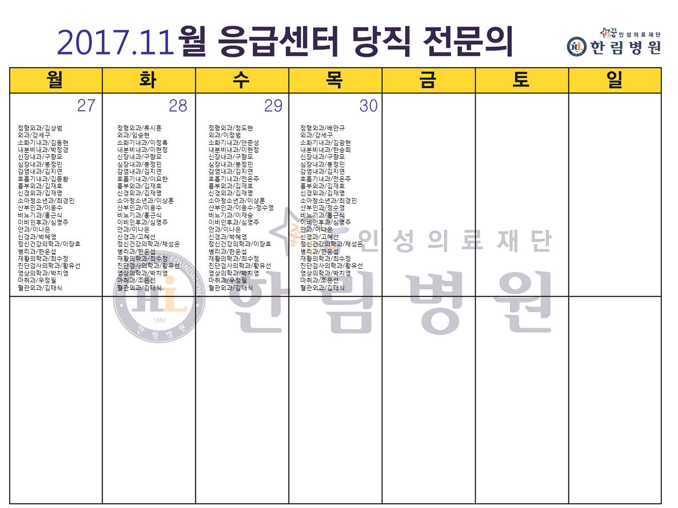 11월 응급의료센터 당직전문의 명단