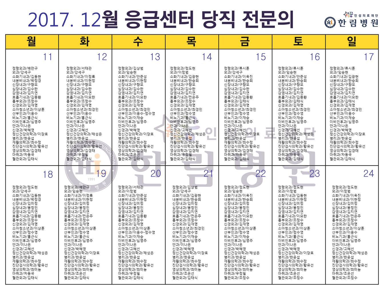 12월 응급의료센터 당직전문의 명단