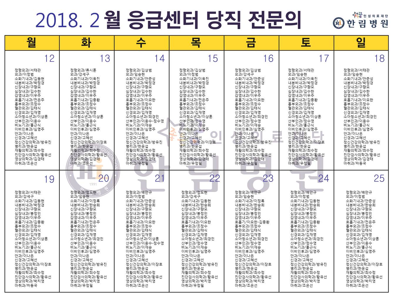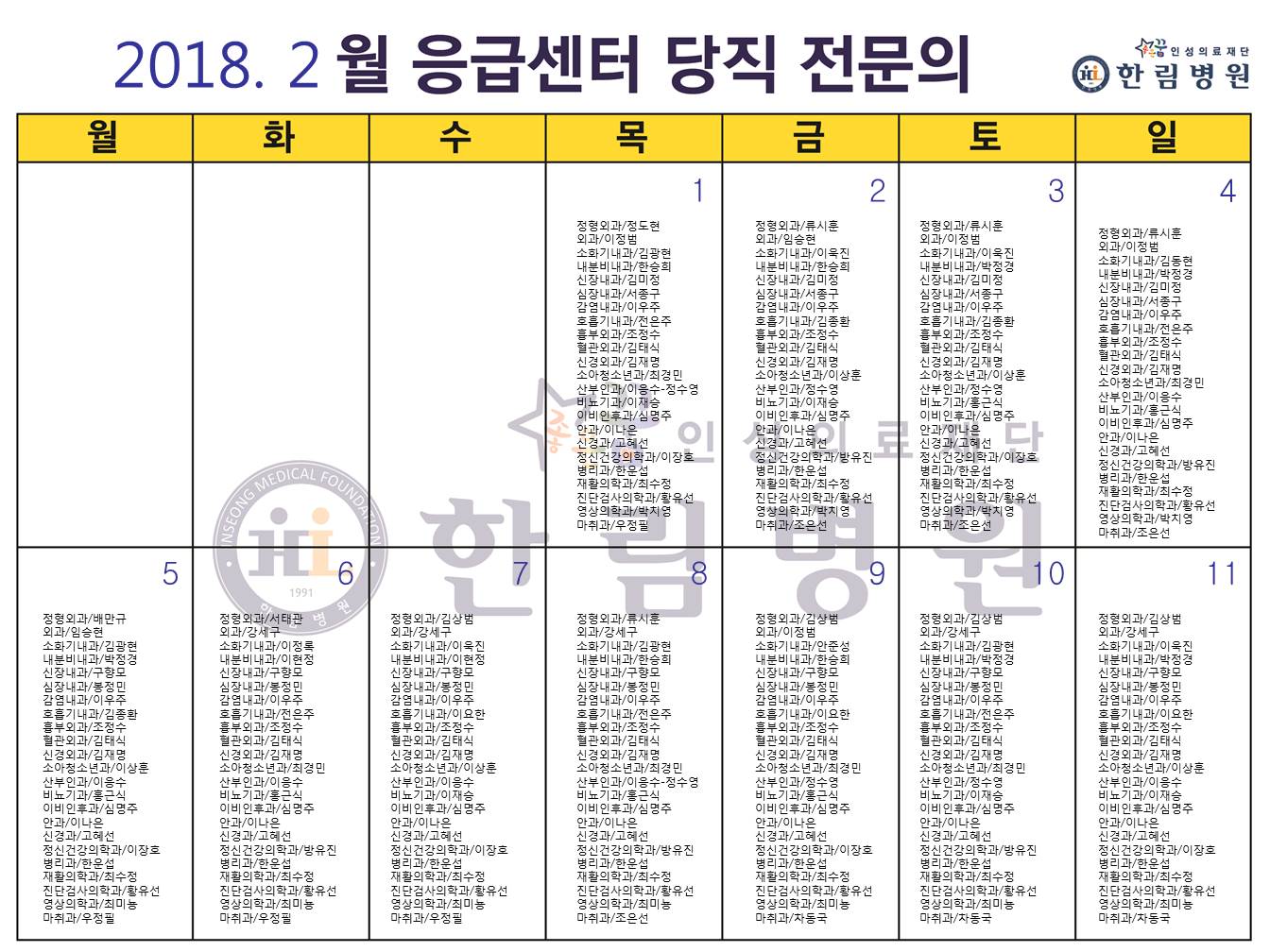 2월 응급의료센터 당직전문의 명단