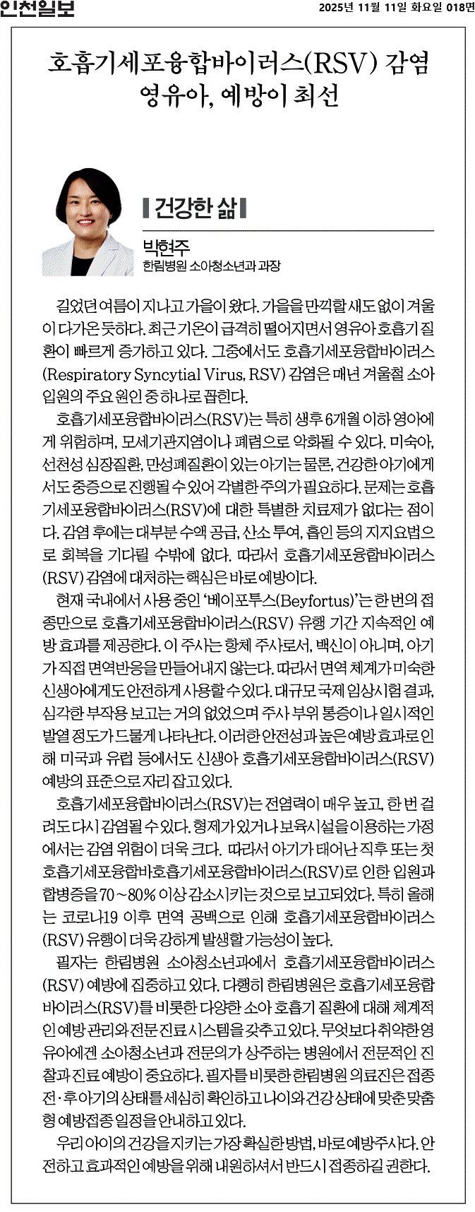[인천일보]호흡기세포융합바이러스(RSV)감염 영유아, 예방이 최선