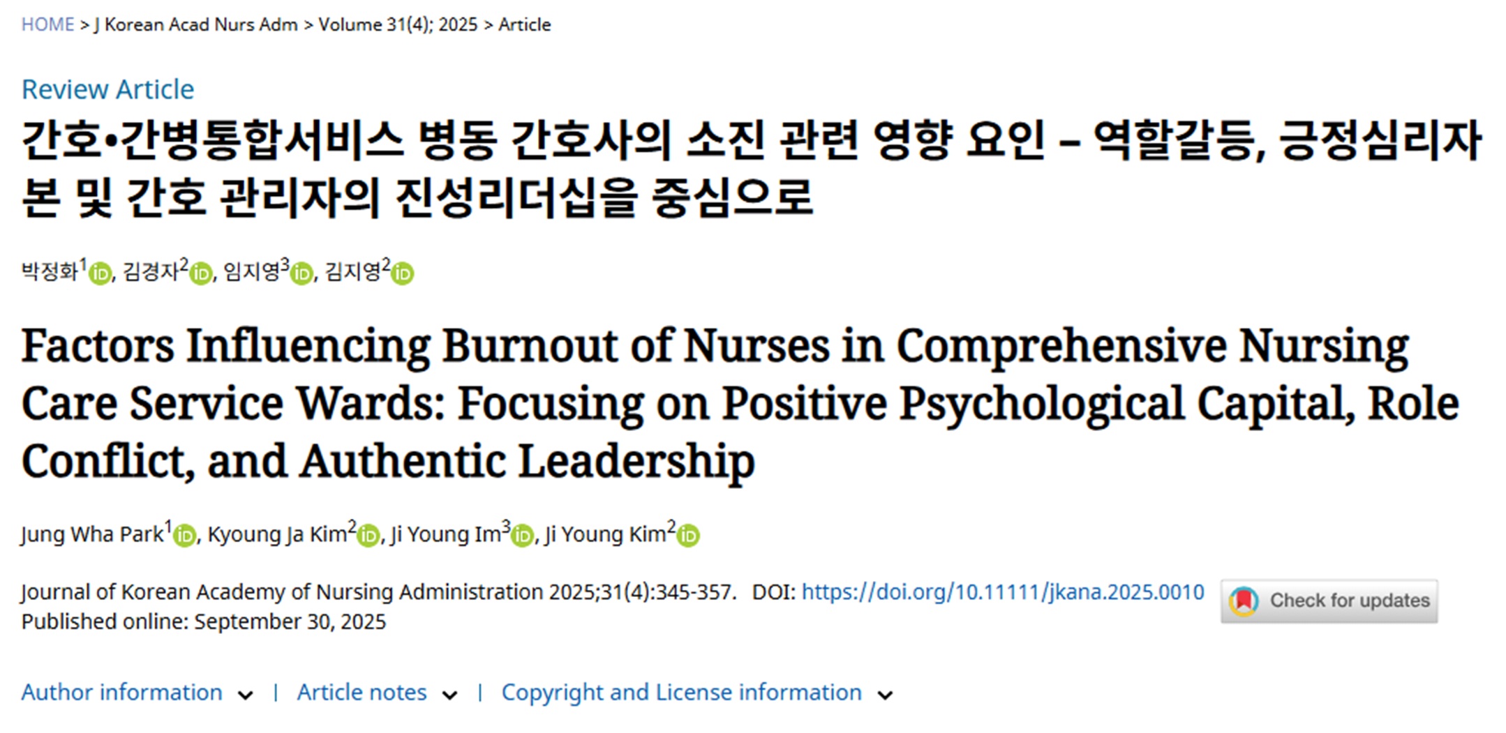 간호본부 박정화 병동간호과장이 제1저자로 참여한 논문이 간호행정학회지에 게재되어,