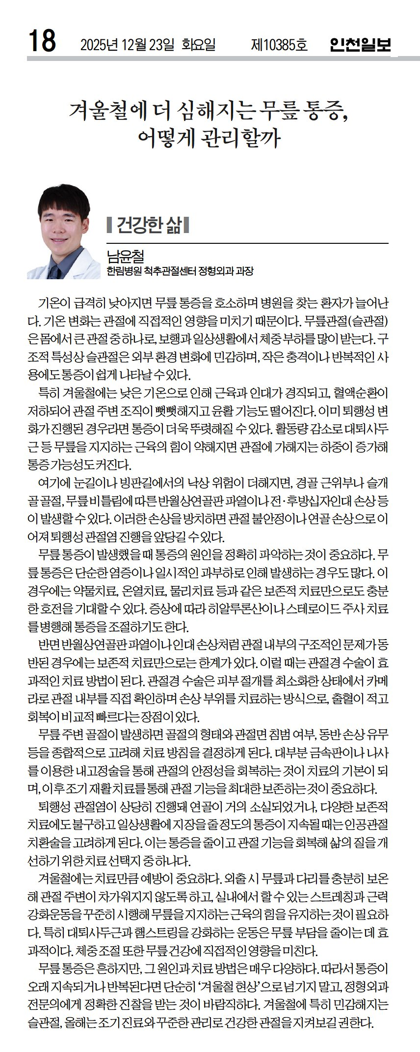 [인천일보]겨울철에 더 심해지는 무릎 통증, 어떻게 관리할까