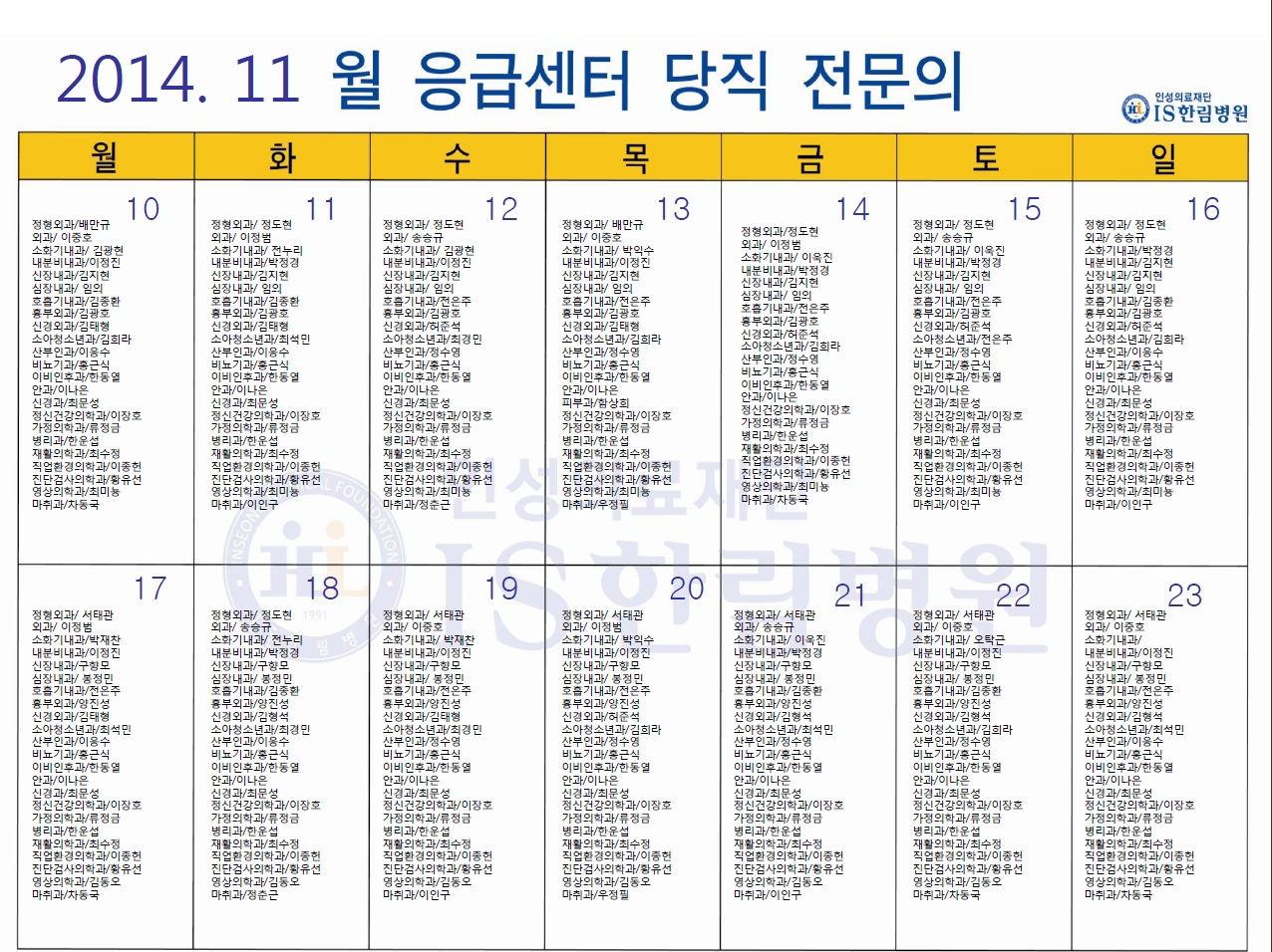 11월 응급의료센터 당직전문의 명단