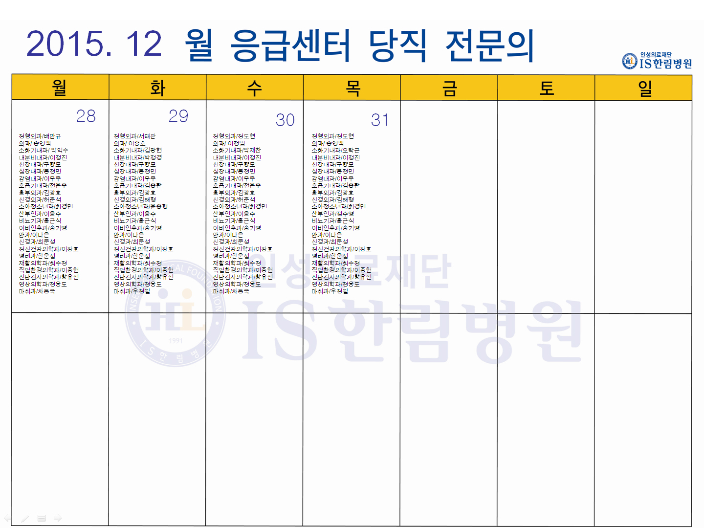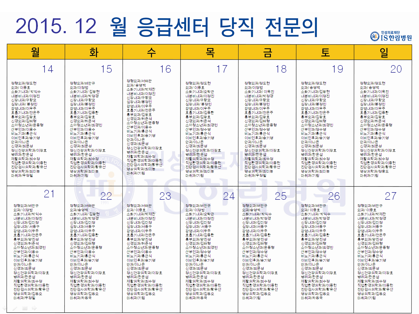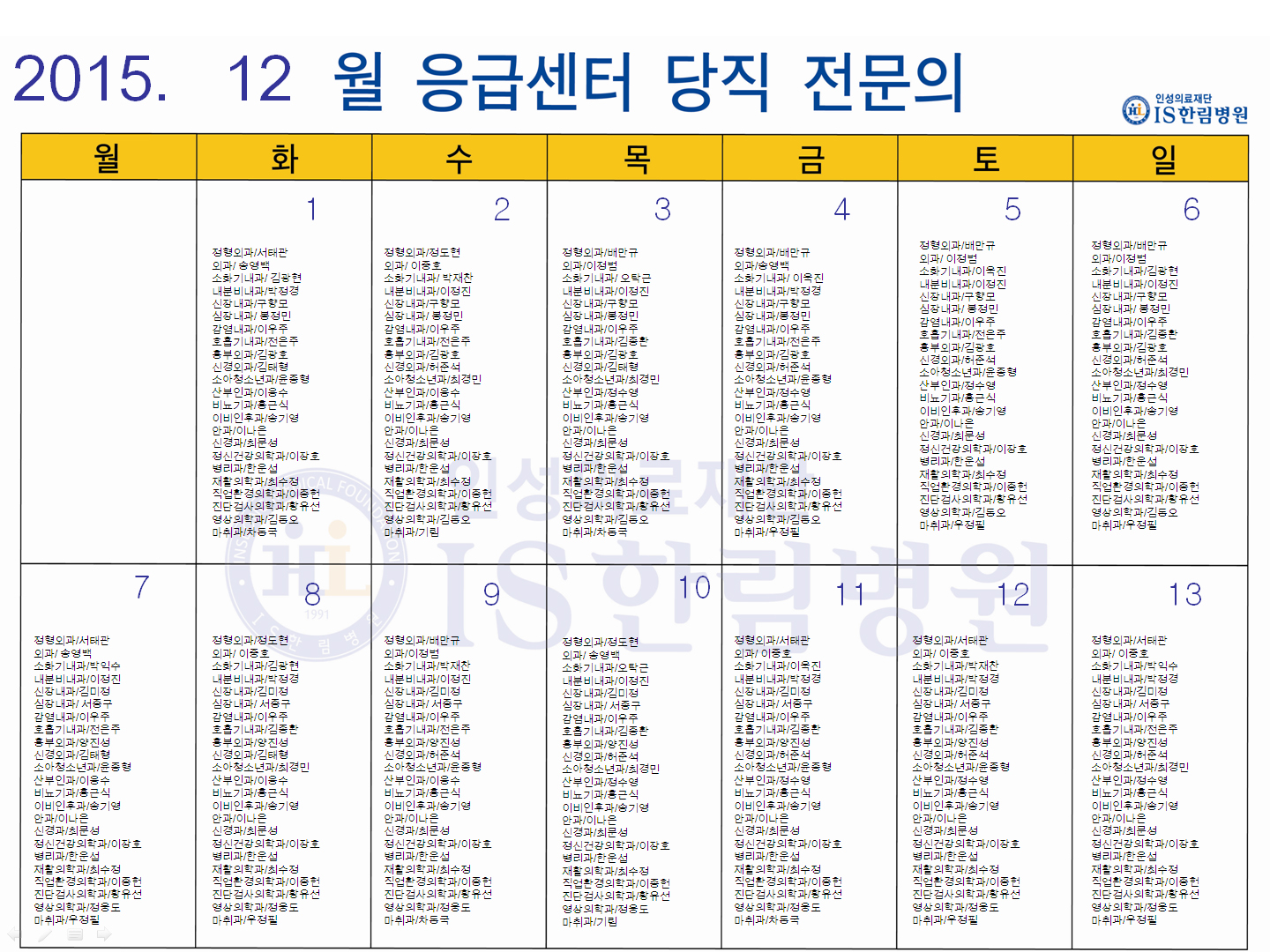 12월 응급의료센터 당직전문의 명단