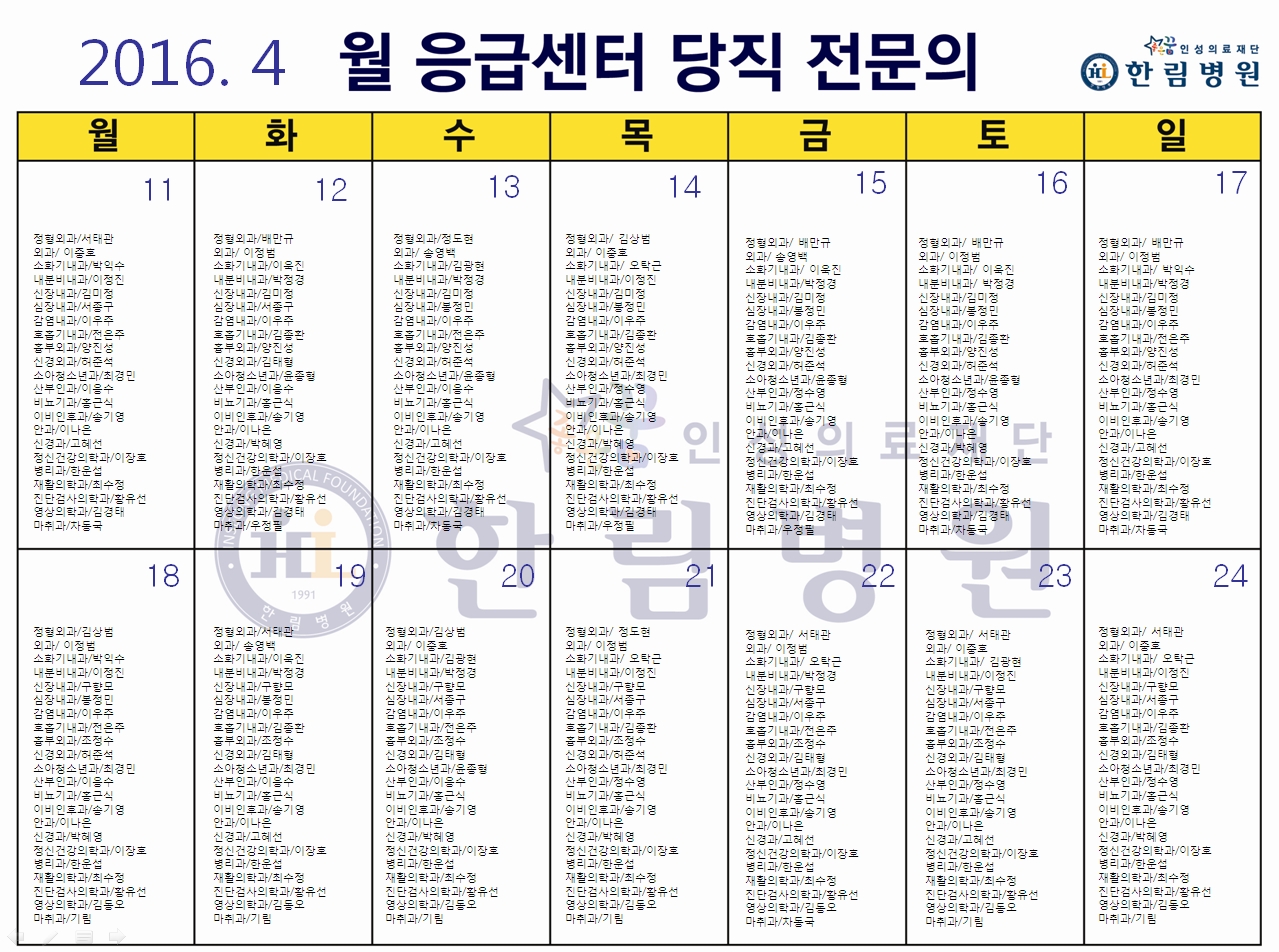 4월 응급의료센터 당직전문의 명단
