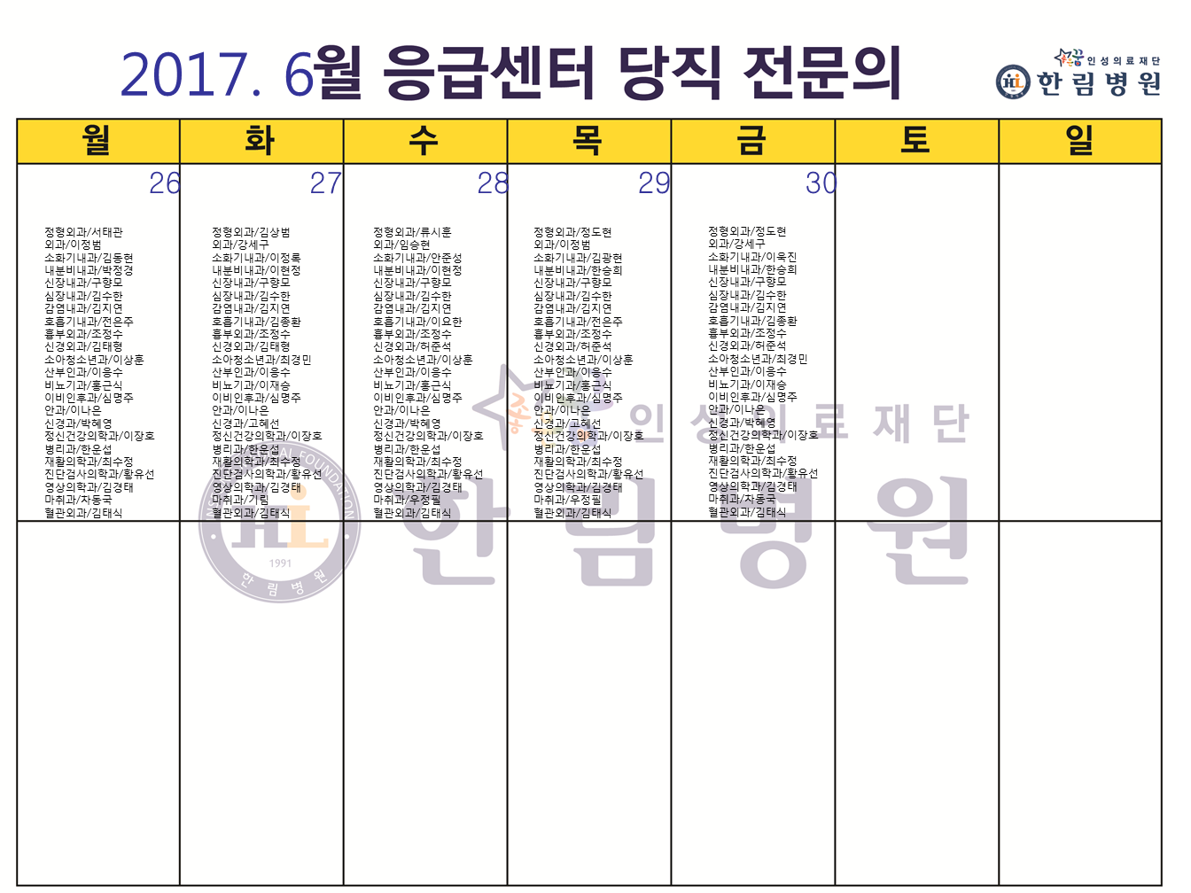 응급의료에 관한 법률' 일부 개정 법률안 공표에 따라 홈페이지에 당직전문의 명단을 게시합니다. 클릭시 새창으로 확대되어 확인할 수 있습니다.