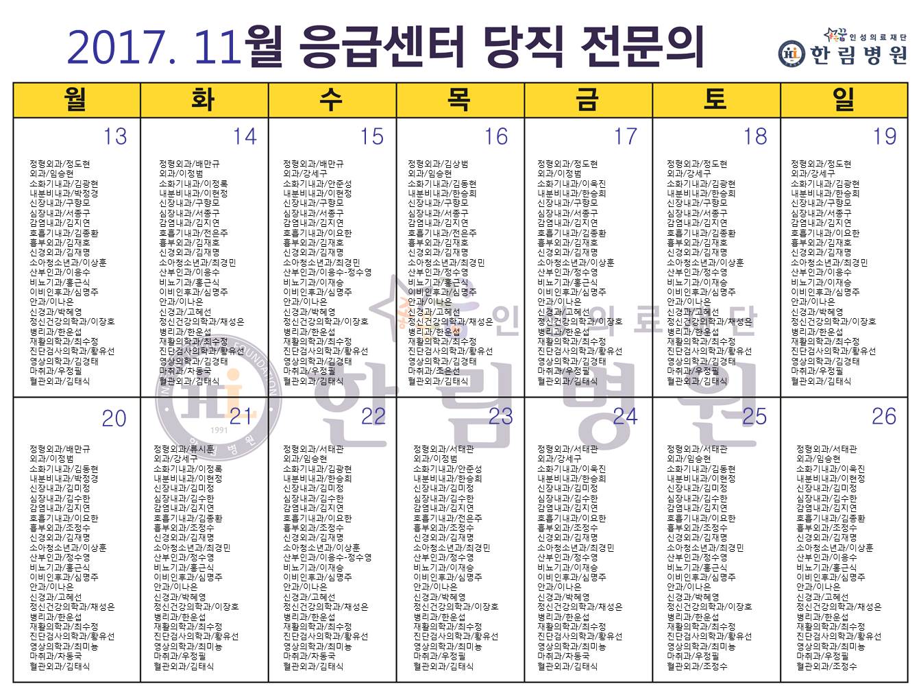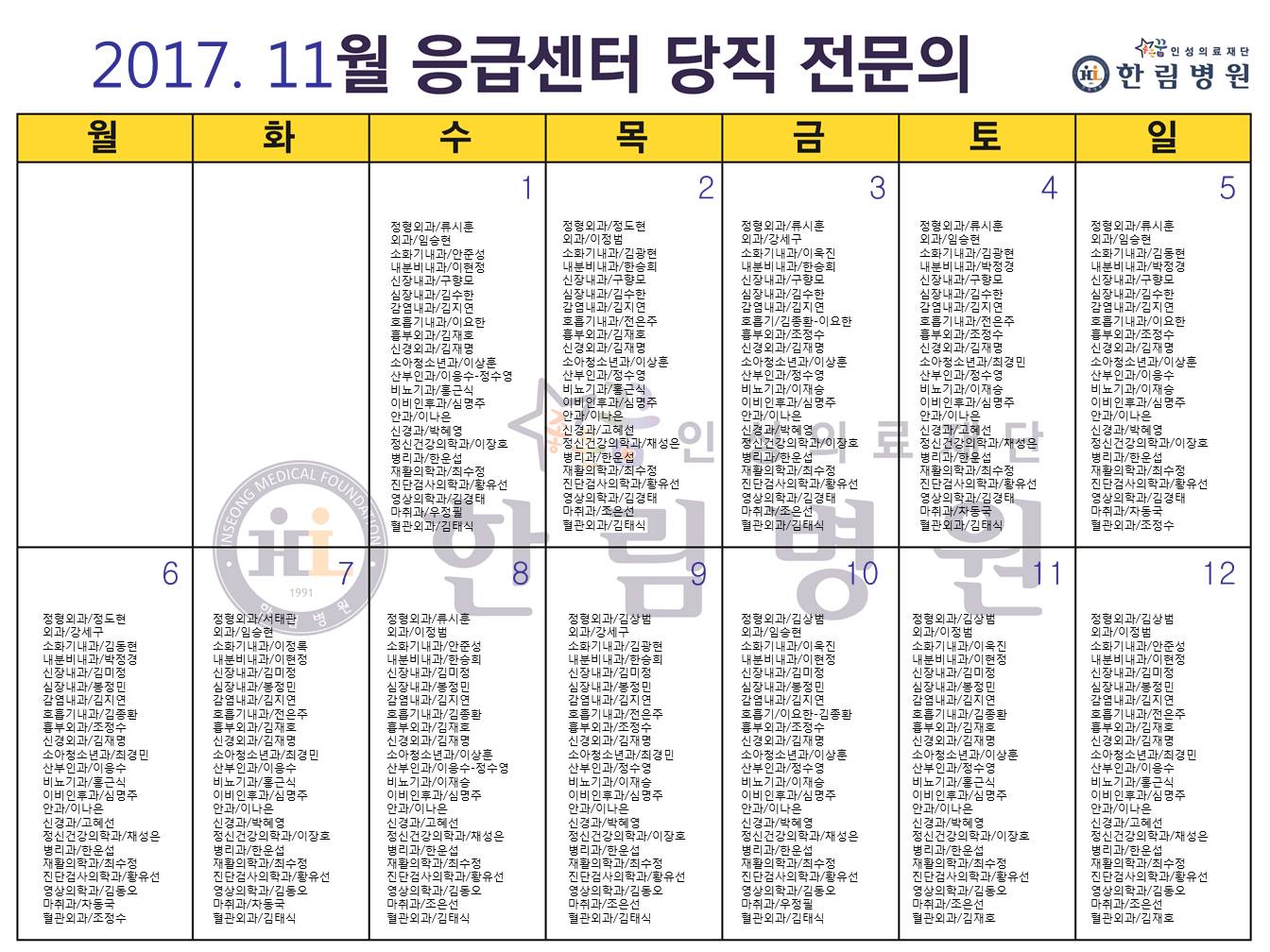 11월 응급의료센터 당직전문의 명단