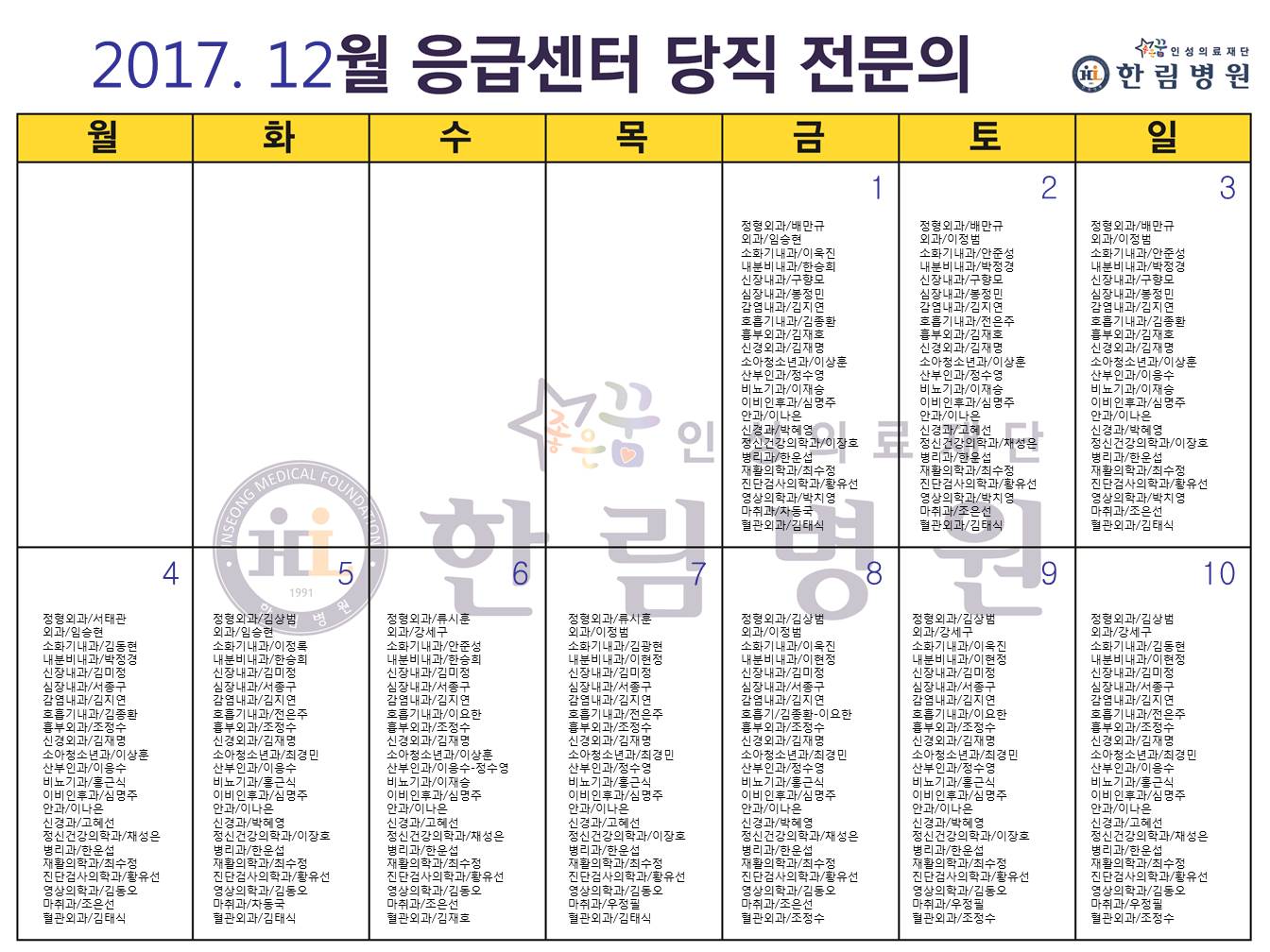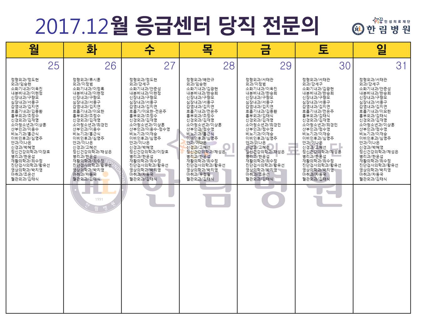 12월 응급의료센터 당직전문의 명단