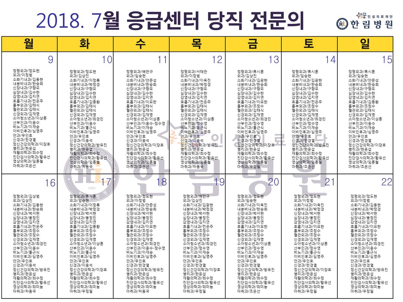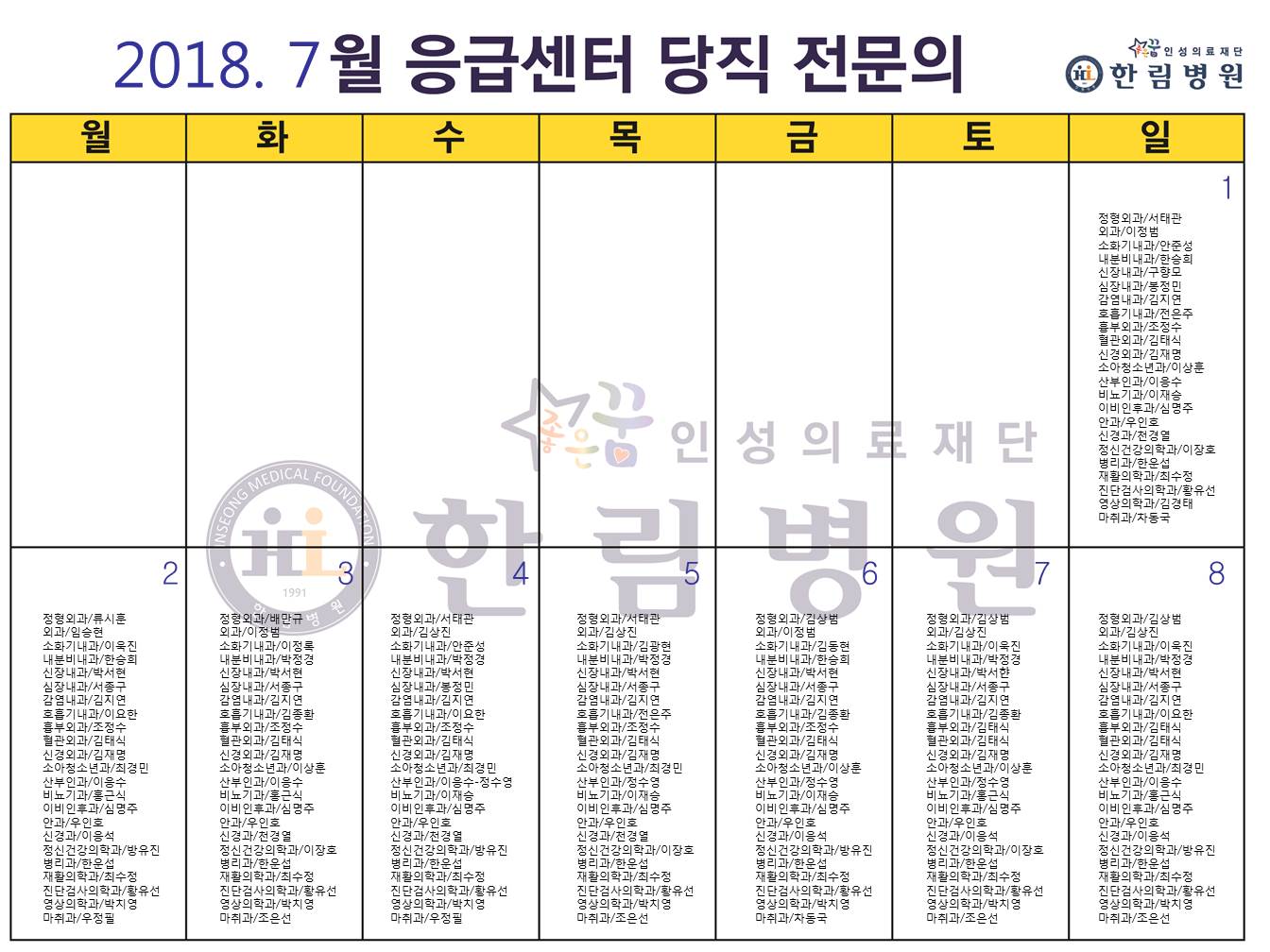 7월 응급의료센터 당직전문의 명단