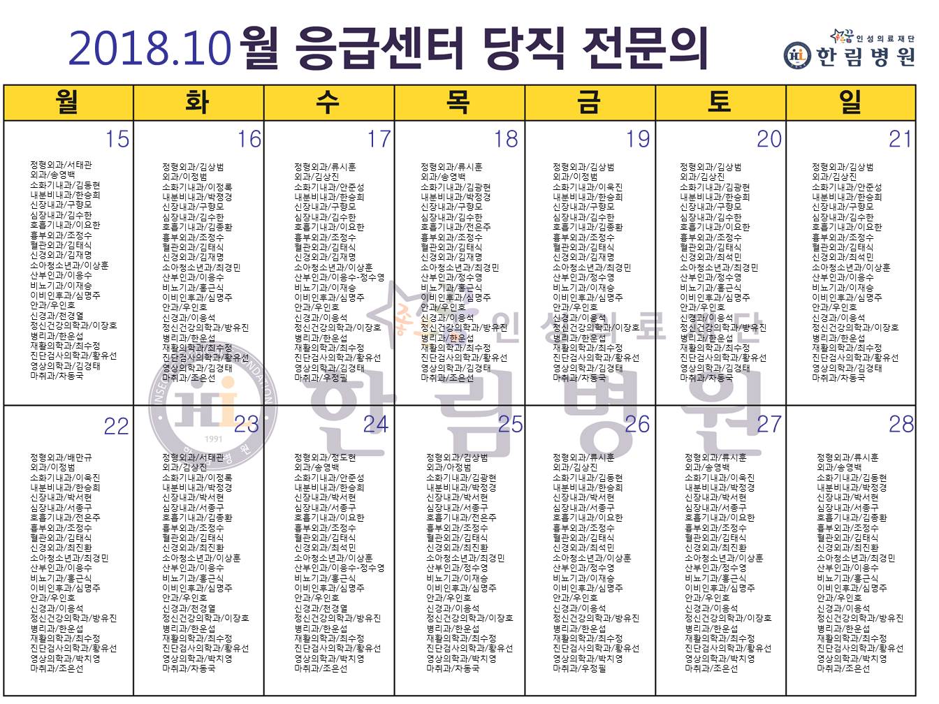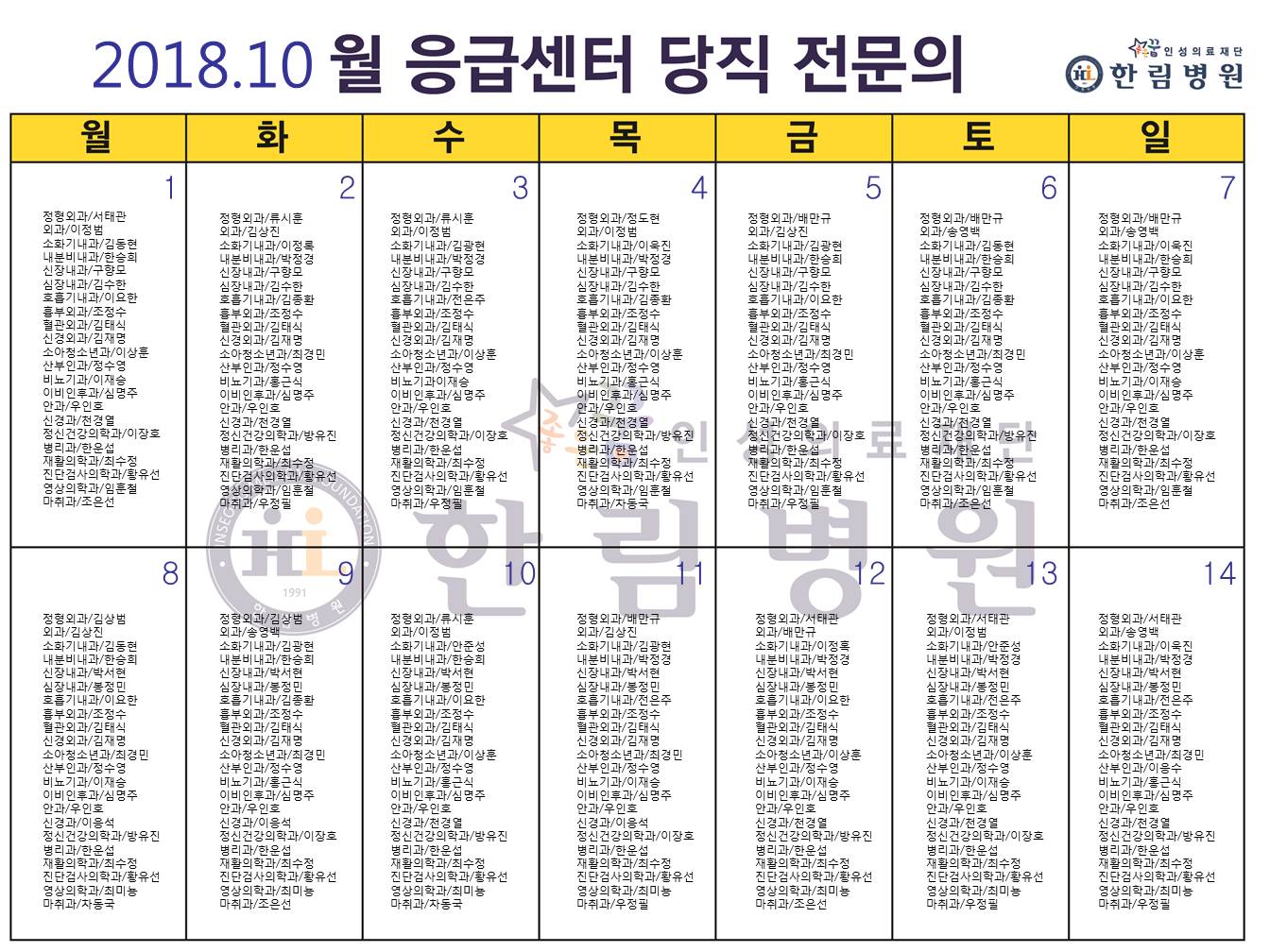 10월 응급의료센터 당직전문의 명단