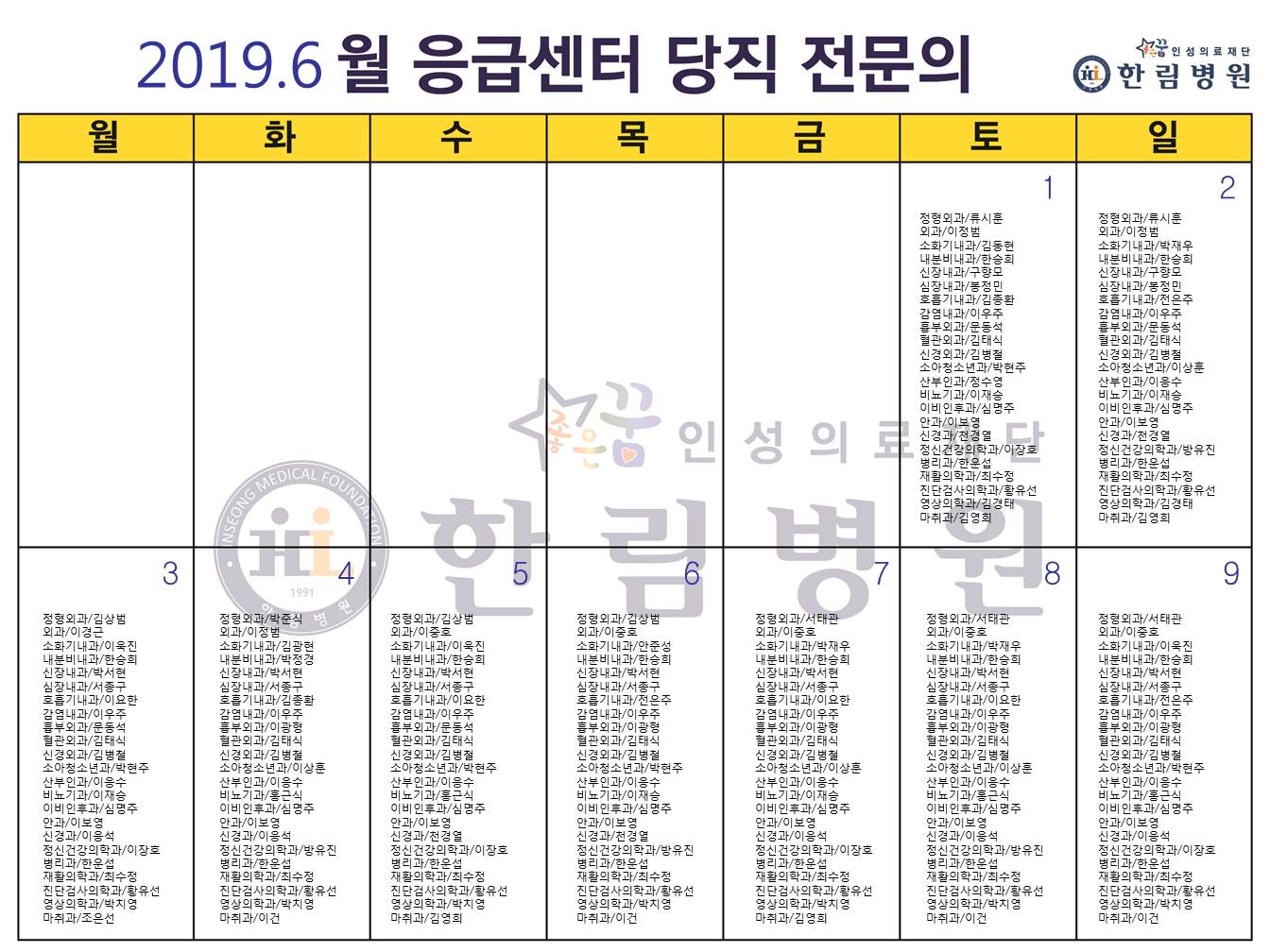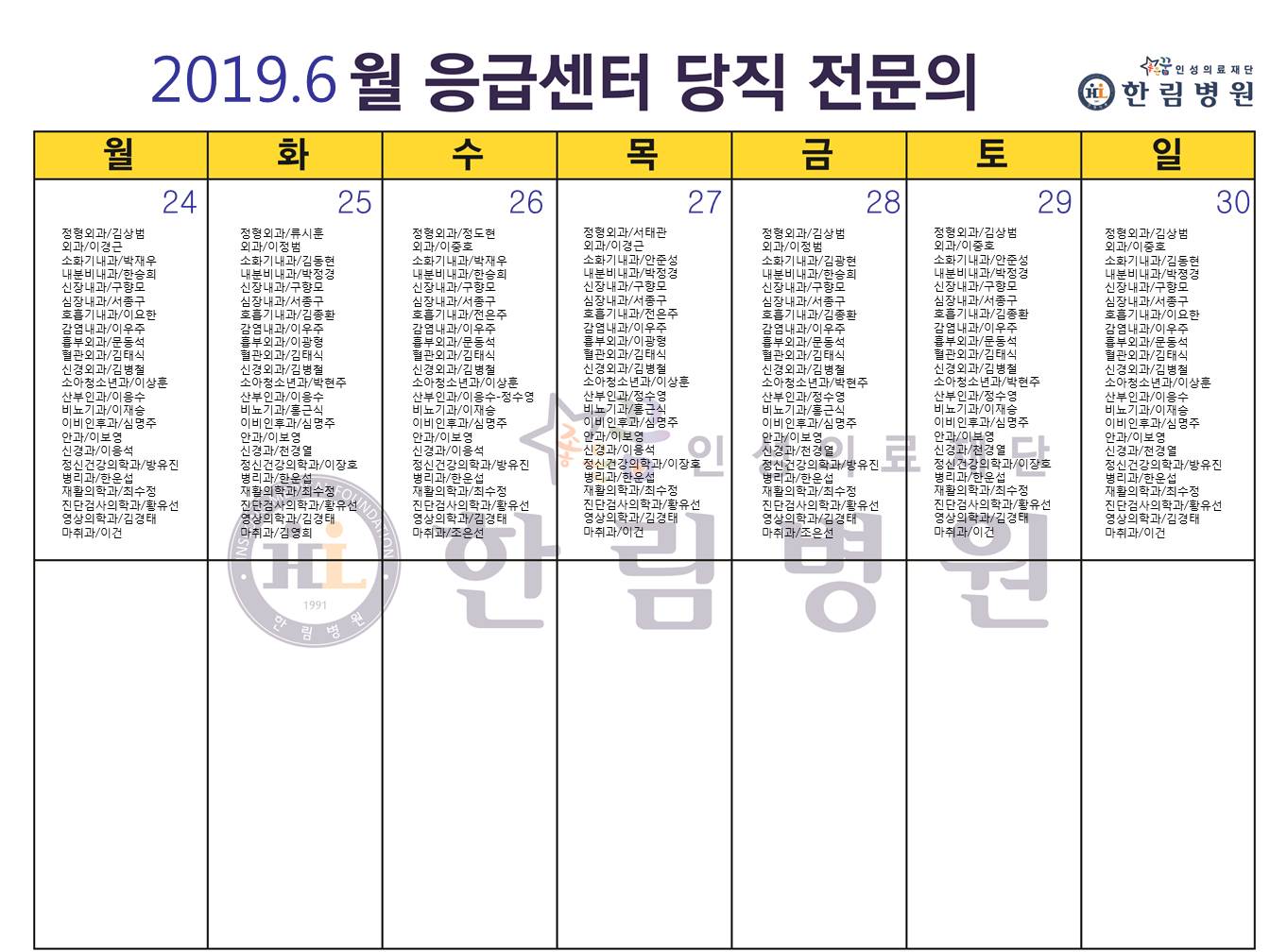 6월 응급의료센터 당직전문의 명단
