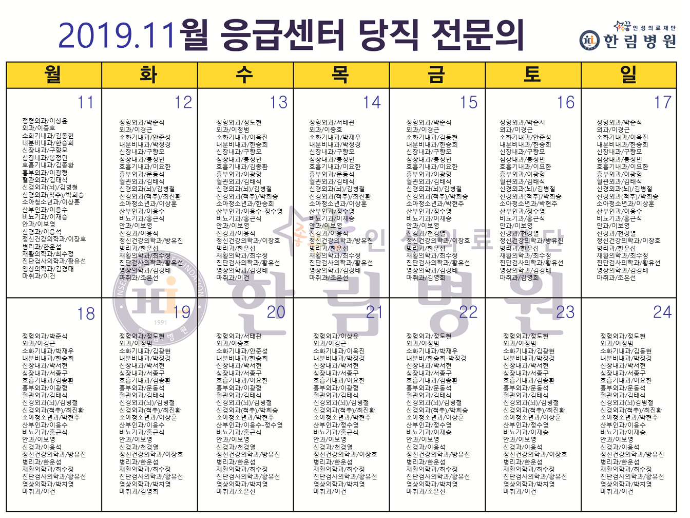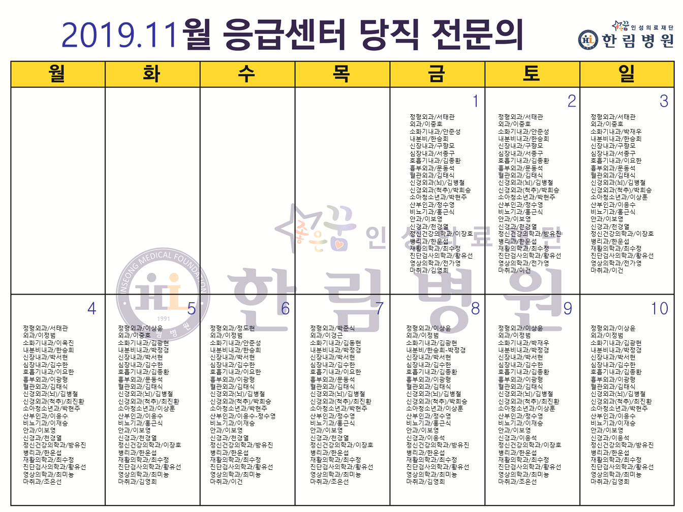 11월 응급의료센터 당직전문의 명단