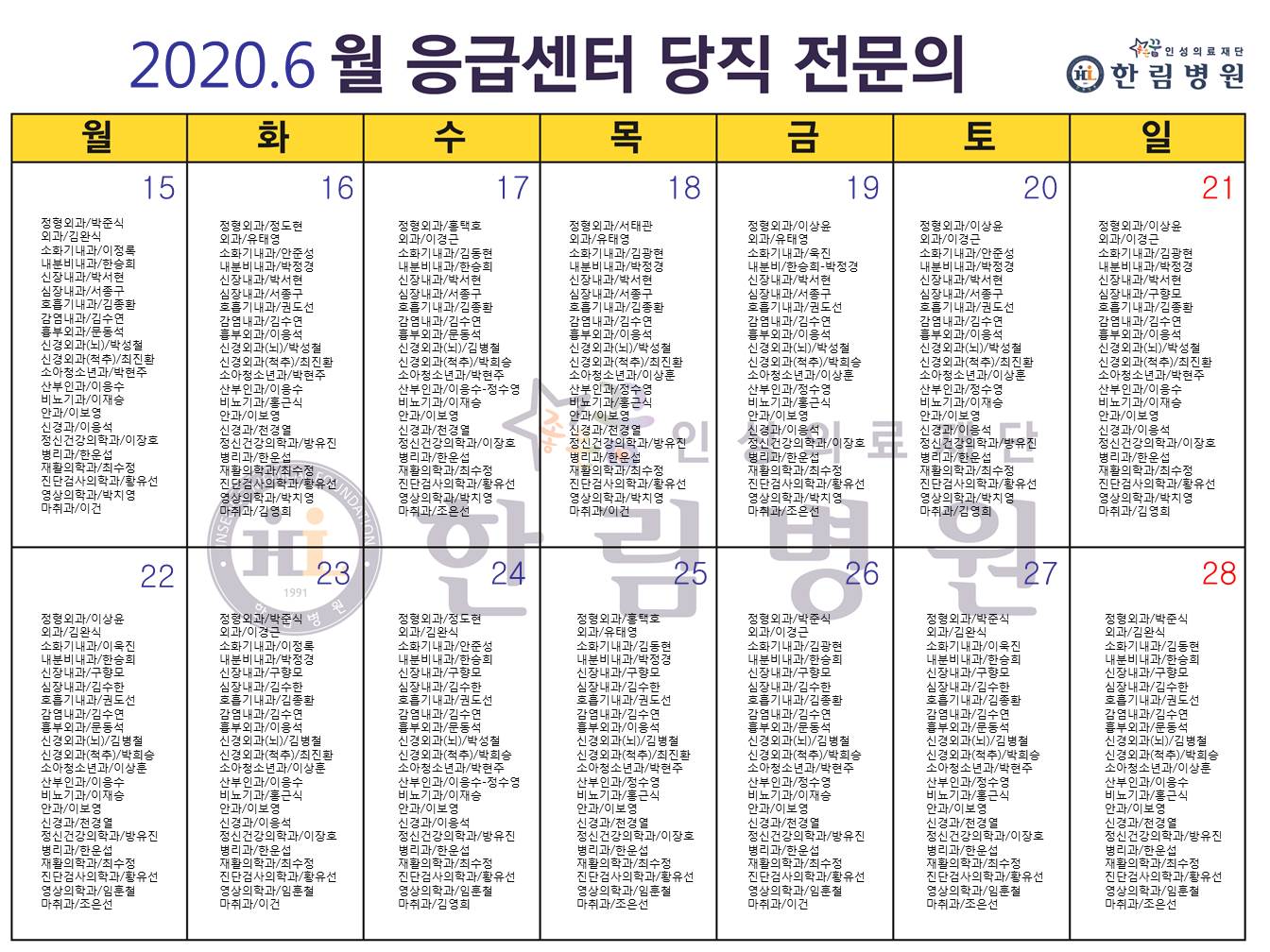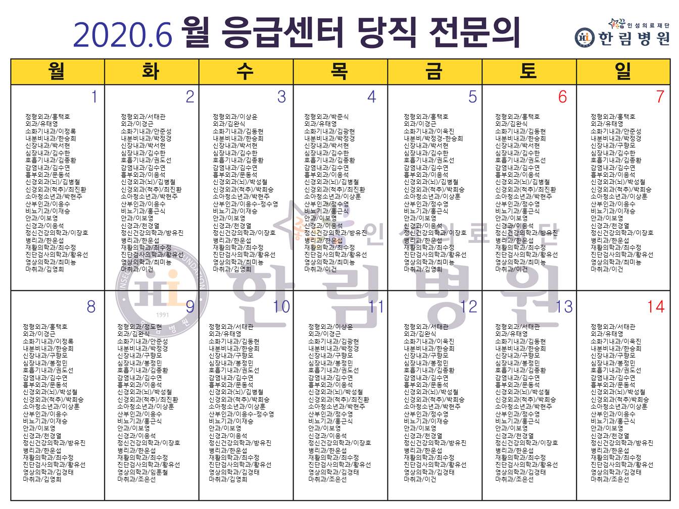 6월 응급의료센터 당직전문의 명단