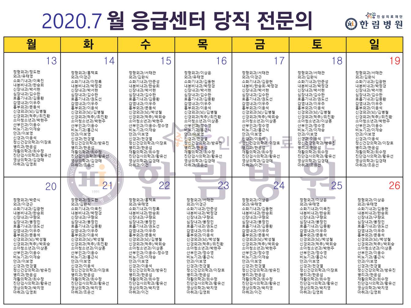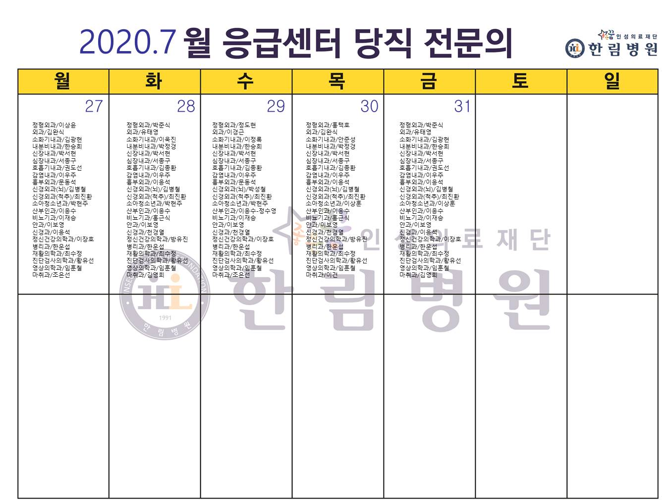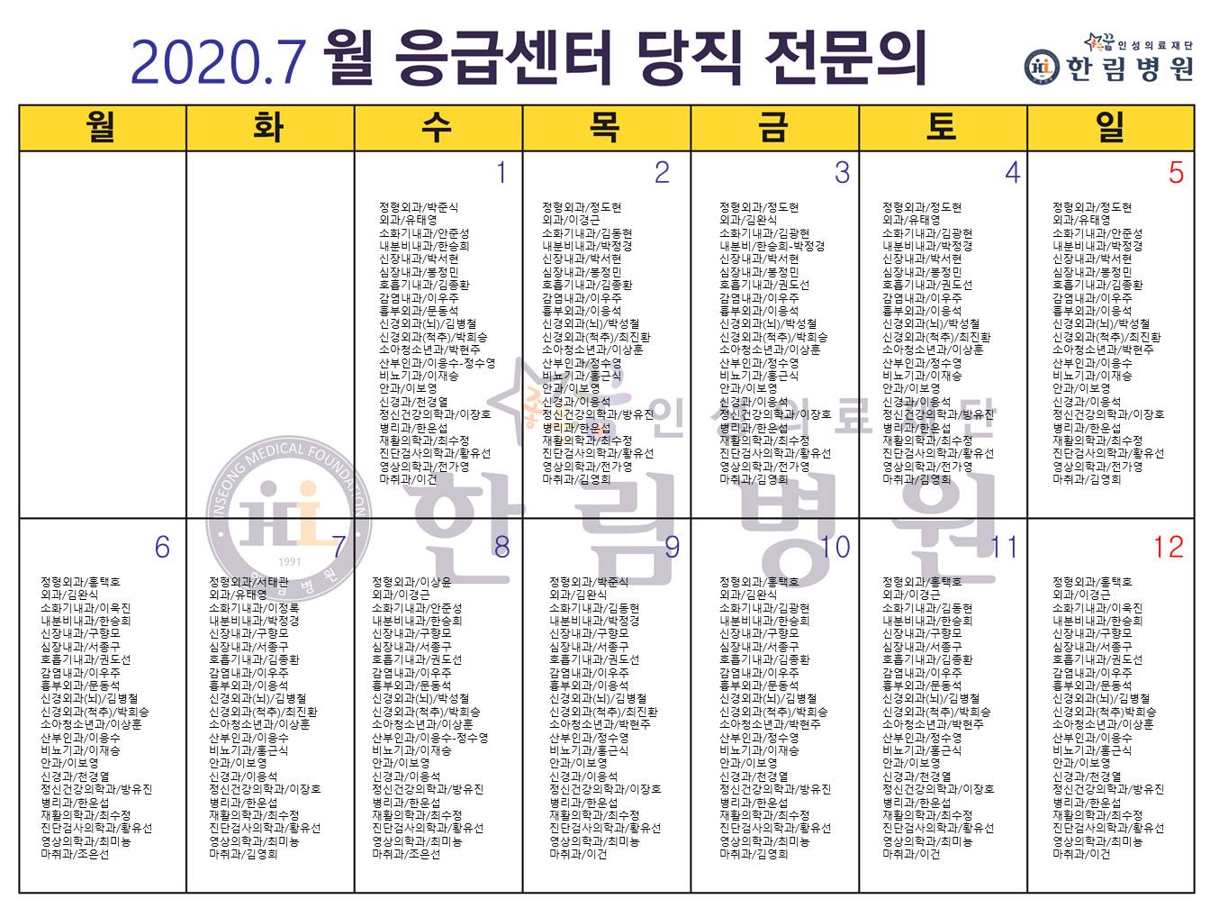 응급의료에 관한 법률' 일부 개정 법률안 공표에 따라 홈페이지에 당직전문의 명단을 게시합니다.