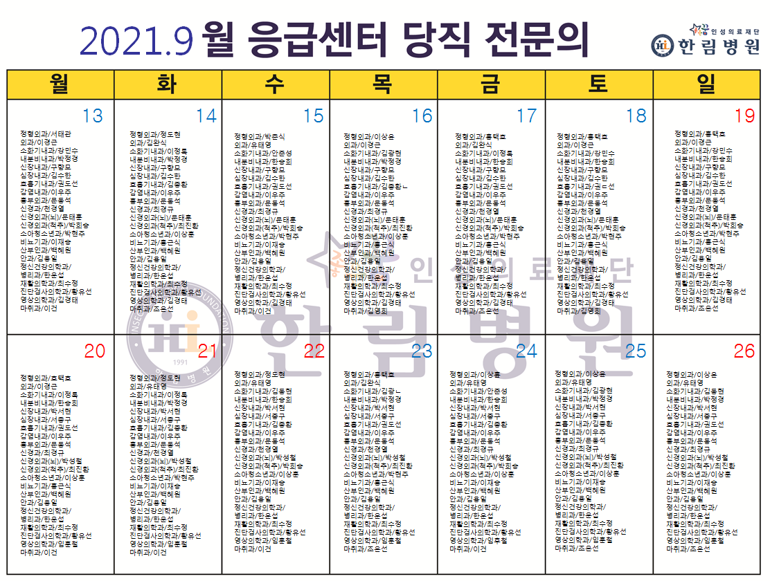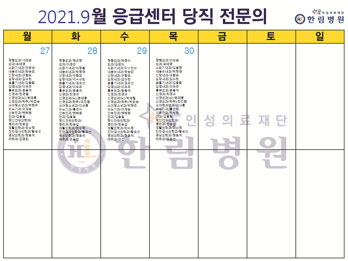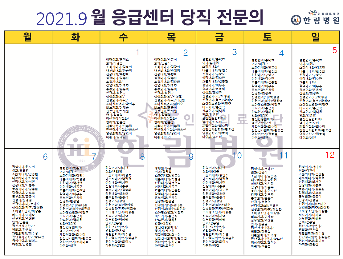 9월 응급의료센터 당직전문의 명단