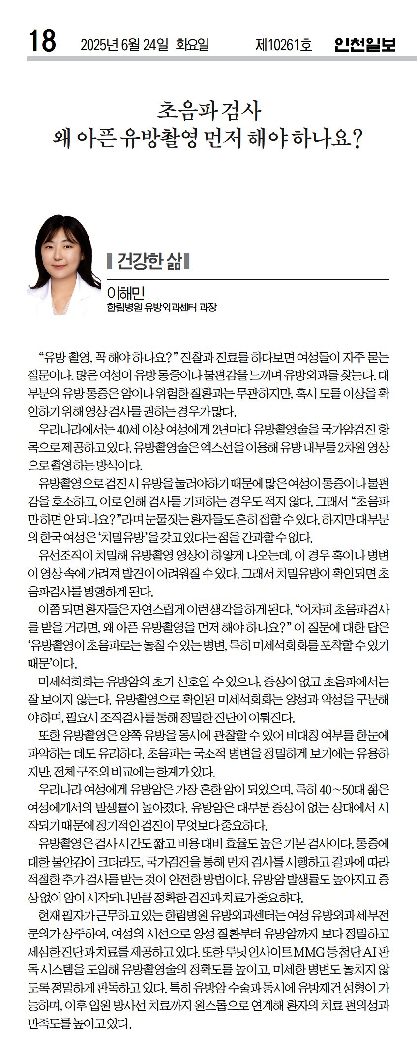 [인천일보] 초음파 검사, 왜 아픈 유방촬영 먼저 해야 하나요?