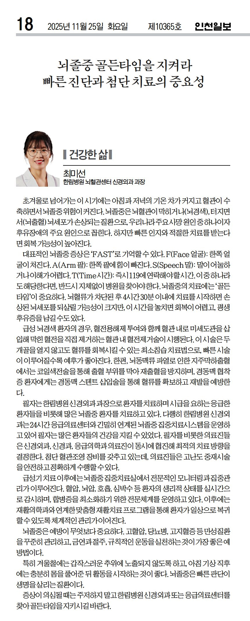 [인천일보] 뇌졸중 골든타임을 지켜라 빠른 진단과 첨단치료의 중요성